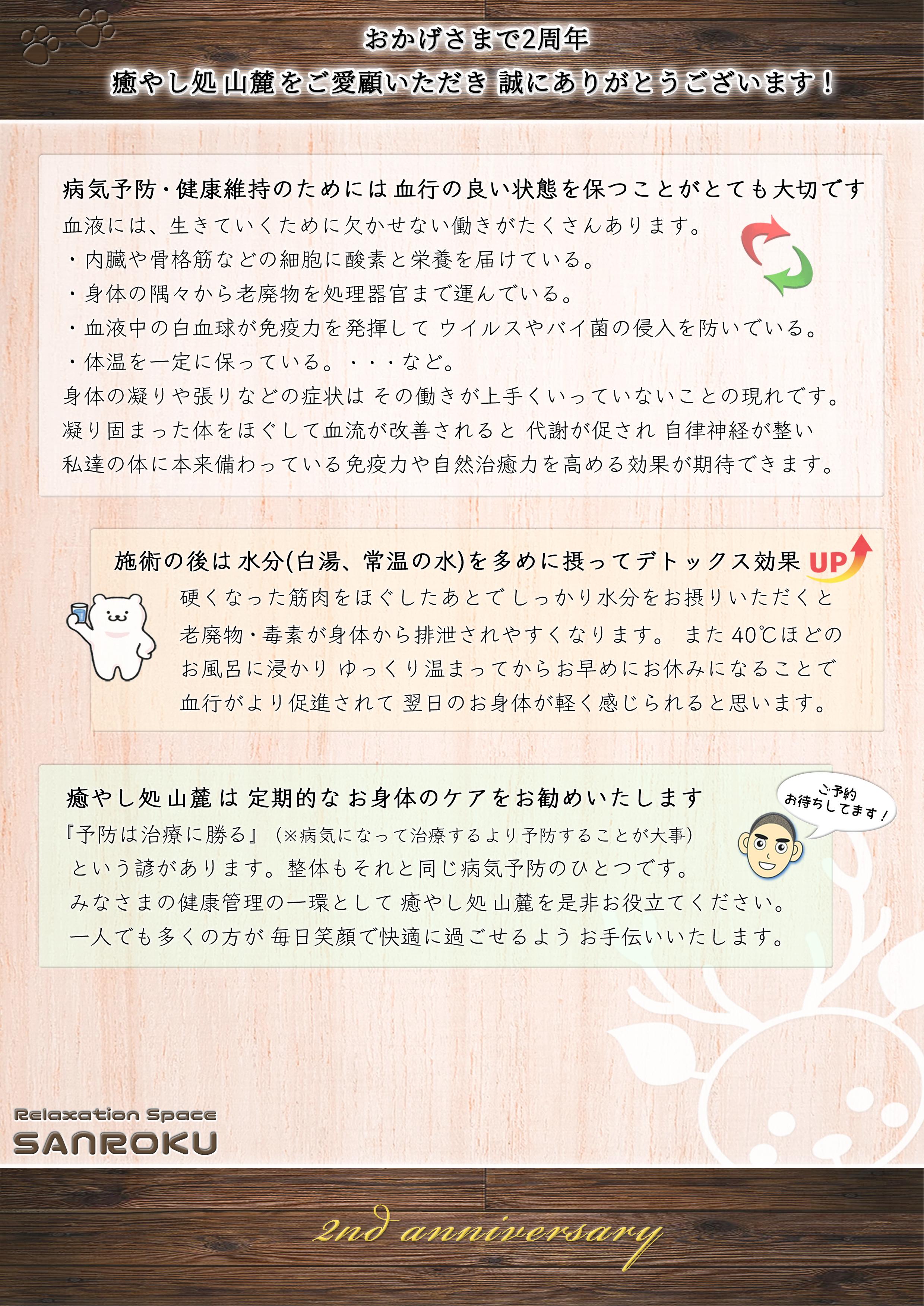 日頃の感謝を込めまして、7月1日より、特にご支持をいただいている『整体65分』以上、『整体&足つぼ90分』以上のコースを、料金はそのままにお時間をそれぞれ5分長く更新いたしました。